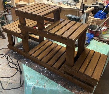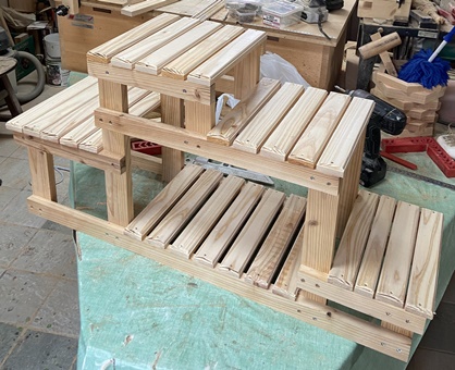 10cm,20cm,30cm,40cm高の階段状の鉢おき。幅80cm、渡し板が25cm長。 前に頼まれて作ったのとほぼ似たような鉢おき、なにげに始めたらあっという間に終わってしまった。^^;; |