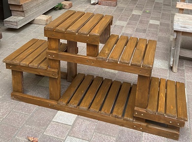 | 天板は何枚かあるデザイン板を乗せようかと思ったけど、同じ材で丸太風に並べることにした。 チーク色で2度塗り、透明ニス仕上げ。...もっと塗って磨いてを繰り返してもよかったのかなぁ..。 |