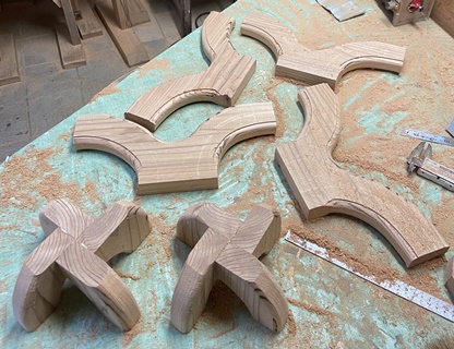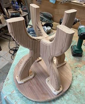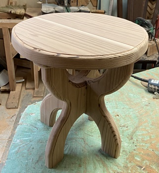 杉の3cm厚板で円形のスツール。 脚組みの形が面白いと思っての製作。 脚のR面カットで切り落とした扇形様の欠片も、何かに使えそうな4本脚になった。(上左) |