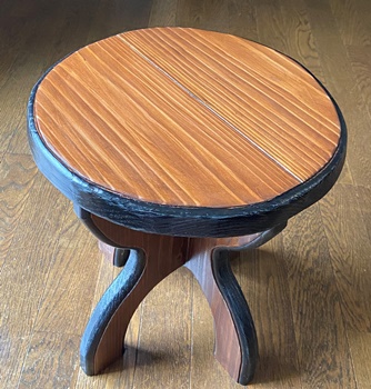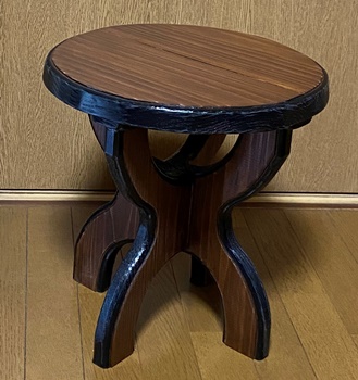 | 高さ38.5cm、天板の直径36cmの円形スツール。仕上げ塗りと磨きを丁寧にやる。 チーク色と縁を黒でアクセント。ガッチリ安定は勿論だけど、きれいに仕上がった。^^ |
