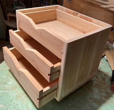 | 抽斗ハコは上2段が8cm、下が11cmの深さで用意。 ハコの側板は12mm厚の杉野地板。薄いので溝を掘るのにちょっと神経使う。 A4サイズの紙はなんとかきれいにピラッと入ったのでOK。(^_^)v |