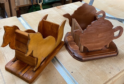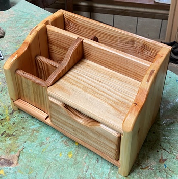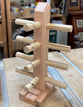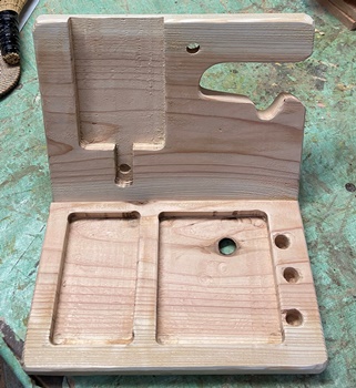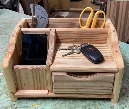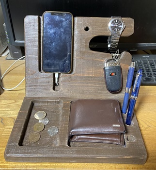 | 小物のDock として組むのにはちょっと材が厚い(19mm,15mm,12mm)気もしたけど、 出来てみると、木の厚みと丸味が却ってほっこりして面白い。オイルフィニッシュで仕上げ。 |