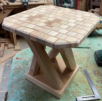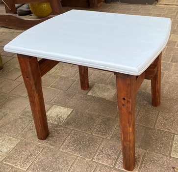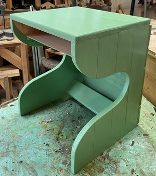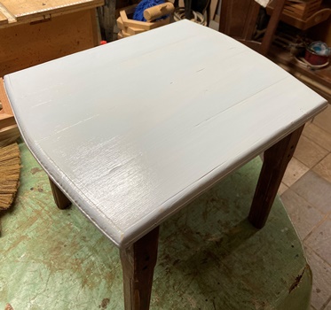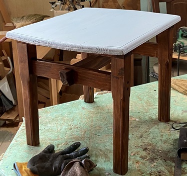 | 子どもイスを買ってくれた人から、イスに座って遊べるテーブルが欲しいと注文が入って。 セットで作っておけば良かったのだけど、イスに座った状態..を想像して高さを決める。(高さがイマイチ..) (折り畳み金具脚は30cm程度なのと、値段が高いので却下。) 縦横38*42cm、高さが37cmほどのテーブル。表面はライトグレイの2度塗り&ニス仕上げ。 |