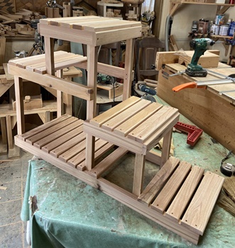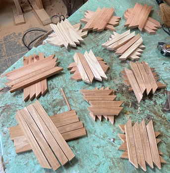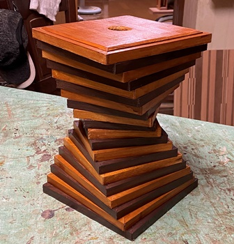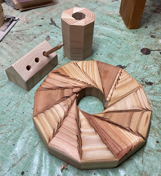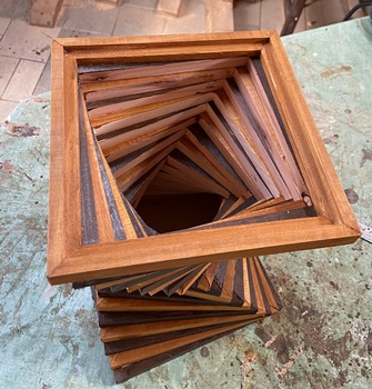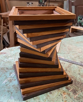 | つい先日、塗りで情けなくしてしまったねじれボックス、悔しいので再度アタック。^^ 15mm厚の杉貫板を1辺12cmから1cm刻みで21cmまで2枚ずつのフレームを20枚。 フレームを20枚作るのと色分け(レッドオーク&チョコ色)するのは、なかなかの手間でした。(^_^;; |