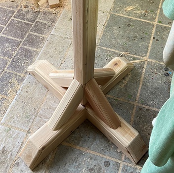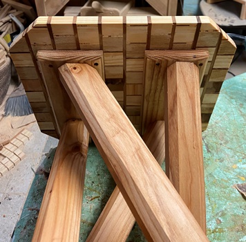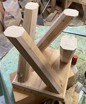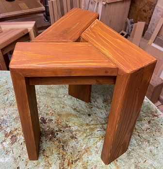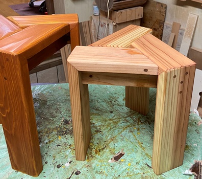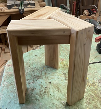 支え板は木口25*60mmを30°カットで三角支え。高さ40cmの三角スツール。 |