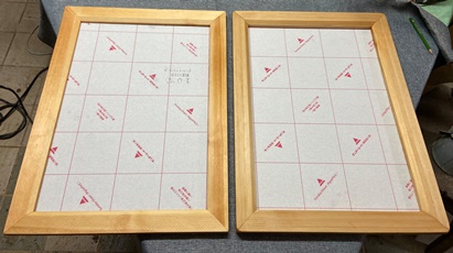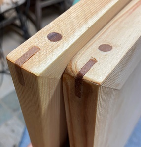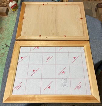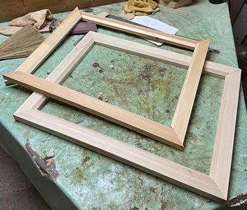 | 4.5cm幅で縦横44.5*60cmの額。コーナーにビスケット埋めたけど、どちらかと言えば飾り。(^^ゞ ほぼ白木に近い状態で、オイルフィニッシュで仕上げ。 |