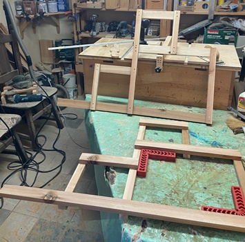 | 木口4.5*4cmの角材を縦挽きし、高さ104cm、幅45cmのフレームを作る。 合板だと雨に弱いだろうから、表面は12mm厚の杉野地板を5枚被せる。 |