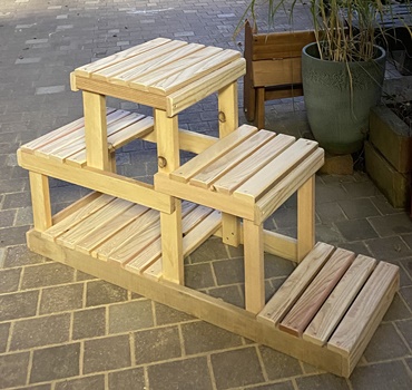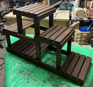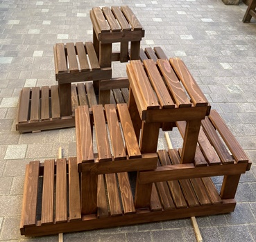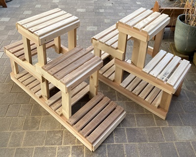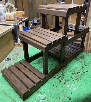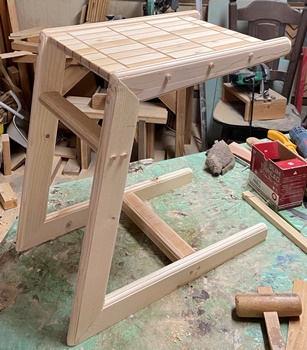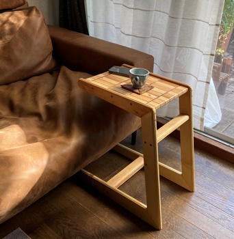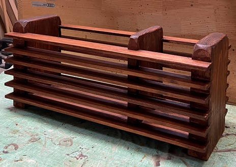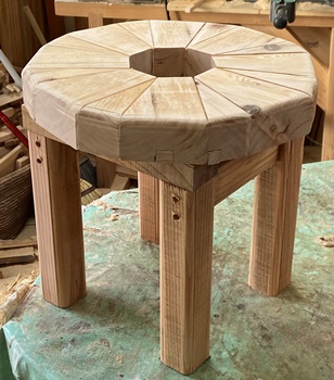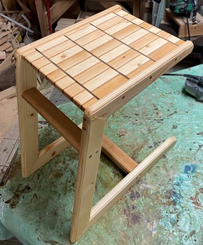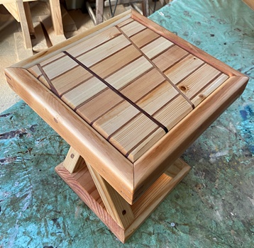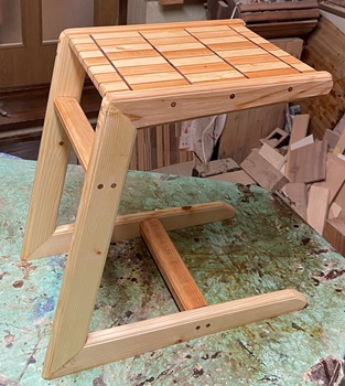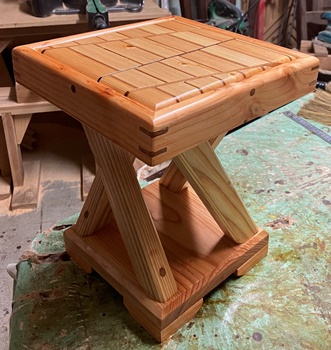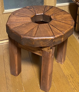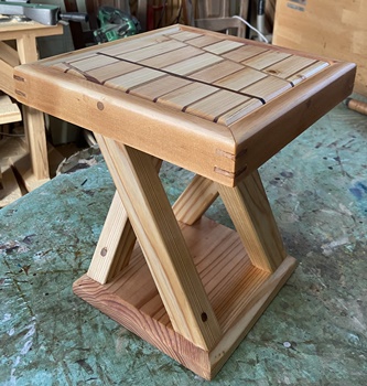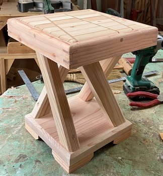 仕上がりサイズが天板部29*36cm、高さ49cm、 下足50cm。 仕上げはオイルフィニッシュ。 スタイリッシュにまとまった。 安定性も十分。(腰掛けにしなければ..) (^^) ソファのサイドや下足をソファの下に差し込んで、 コーヒーや本など乗せておくとくつろげる。