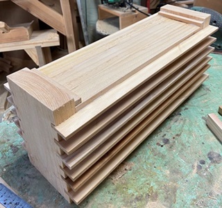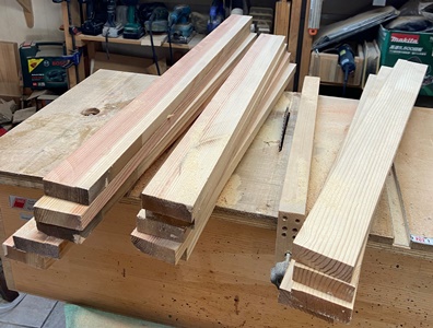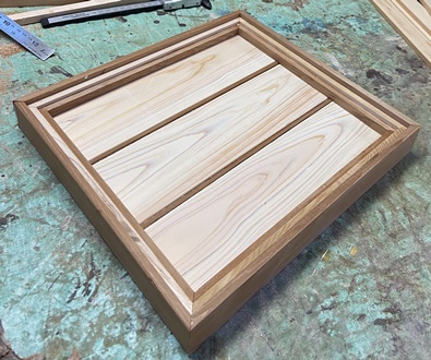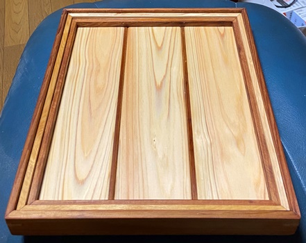 材はヒノキとレッドシーダ、枠の2列目の白い材と裏側のサネが多分?赤松。 やはりいい材使うと仕上がりも上品。 仕上がり寸法が縦横 31*28cm 、 裏面にサネを 4mm 底上げで通し、 外枠が 38mm 高。 気に入ってる一品。(^_^)v