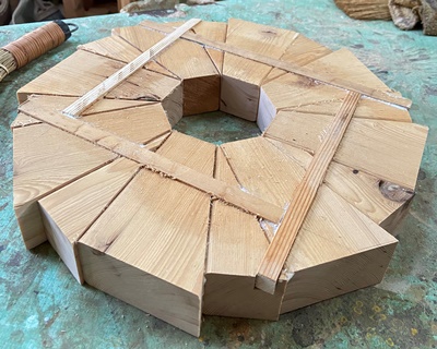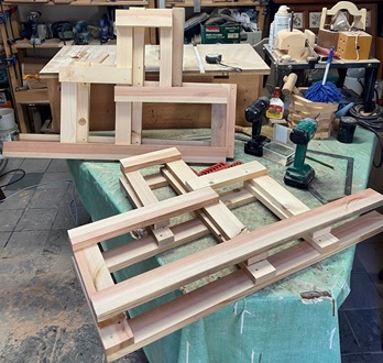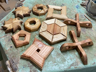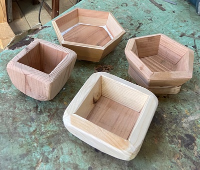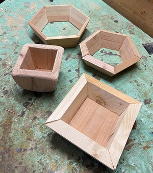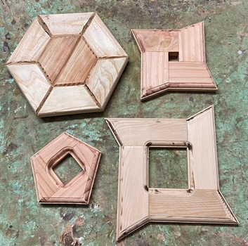 台形状にカットして、角度(10~15°)をつけた板組みを切れ端で試作。(遊び) 六角形の1つは最後の1枚が収まらず。(*_*) 角度カットの微妙な誤差と、辺の長さなどがアバウトだったのがダメ。 底面をフレームの下に約1cmほど押し込んで容れ物風に整える。 何に使えるか、まったく不明。^^