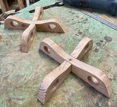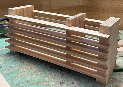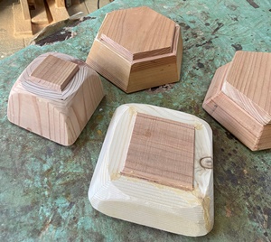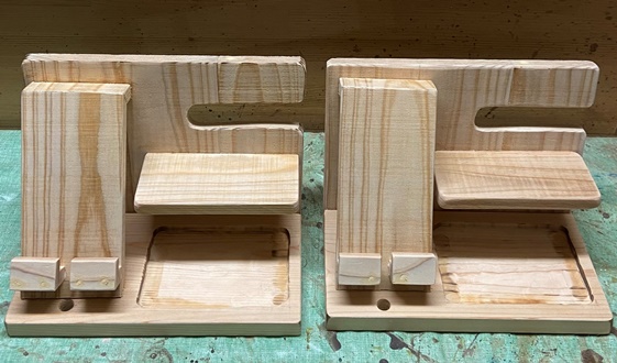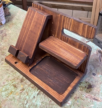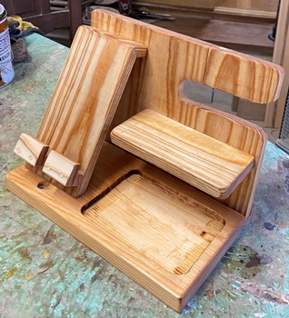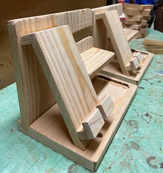 ずっと以前にも似たようなのをやっていて、 今回は同じ形のを同時に2つ製作。 壁板が溝掘り(16mm幅)の関係で15mm厚の杉板に角度がついてしまって、スマホ立ての角度にちょい手を焼いた。 しかし、なんだかんだ言っても最も手がかかったのが底板右の小銭入れ(小物おき窪地)。 直線掘りで収まらない溝掘りはわりと大変なんです。(^^;; 左がチーク色、右がオイル。 オイルだけのが世話なしで、スッキリ仕上がる気がします。 大きさは縦横**cm..というよりは、私のiPhone11がぴったり収まるサイズ。