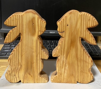 | 暮れに作った干支のうさぎオブジェ4点が、なんと完売 !! m(_ _)m で、新たに注文で作ったのがシルエット状の対うさぎ。こっちの方がちょい大人っぽい。 |