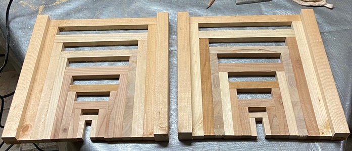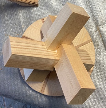 木口4*3cmで18cm長の角棒を、2cm深さで溝掘りして3本を縦横十字に組んでみた。 |