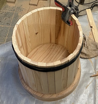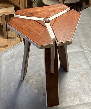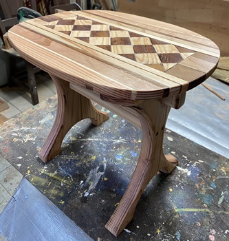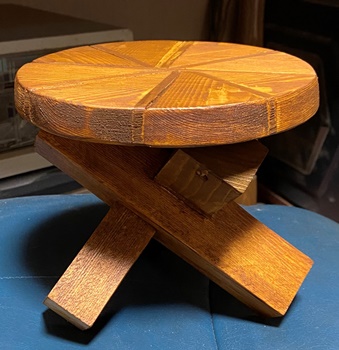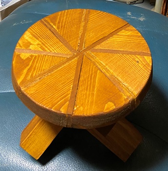 小テーブル (上の樽づくりで、底面と蓋で円形カットした残りを組んだら脚ができた..ので。^^ ) |
