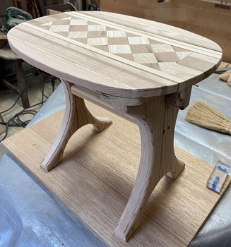 天板に、前に作ってあったデザイン板(18mm厚)を楕円形にカットして乗せる。 |