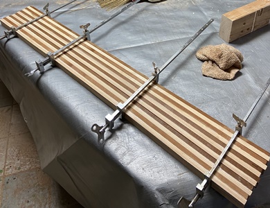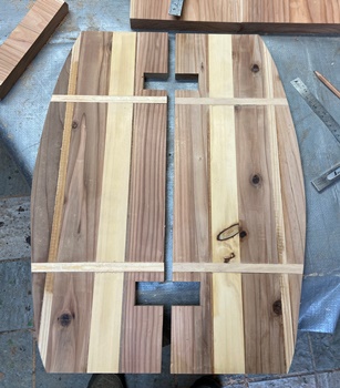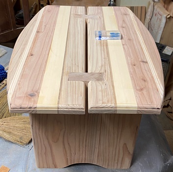 接ぎ合わせて作った板、半分ずつの天板にしてテーブルを製作してみた。 |