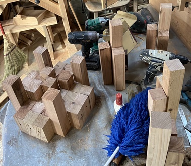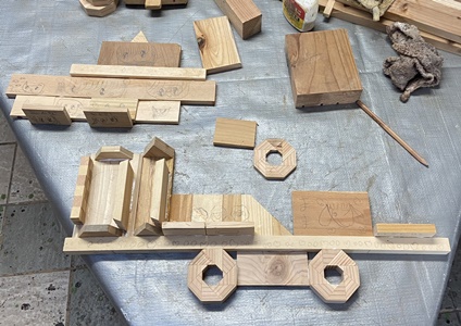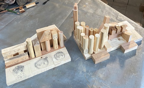 作業場に乱入してきた孫ムスメたち(6才と5才)が、切れ端で遊び始めて、工作が始まった。