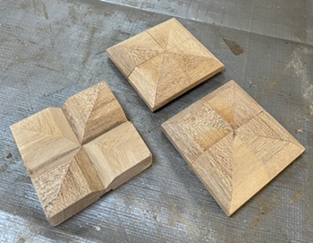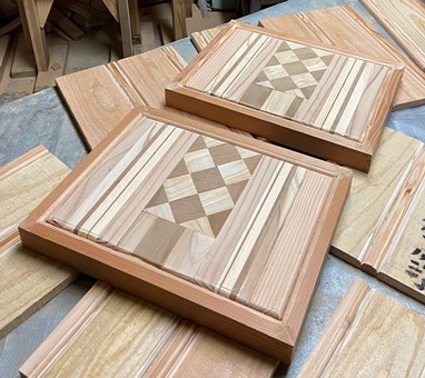 額縁カットで同じ三角形が端切れでたくさん出たので、おまけに寄せ木(9cm角)ブロック。(右上) |
