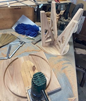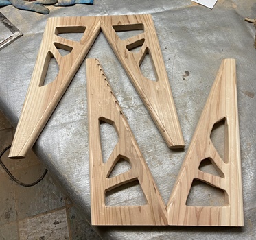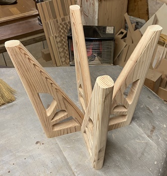 | 3cm厚の杉で飾り穴のある脚を作る。脚は面に対して外に7.5°傾くようにカットする。 |