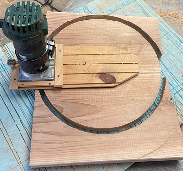 同じ3cm厚の天板。いつもならジグソーでカットするところを、トリマーで正円カットする。