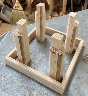 | 脚の組み方で試作したもの。20cm長の脚に切り欠き入れて額縁フレームにはめ込んでみた。 |