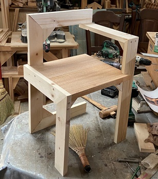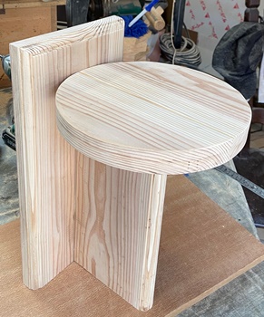 材は天板部が20mm厚ラワン、脚が19mm厚のSPF。座面が30cm四方、座面高さが35cm。 |