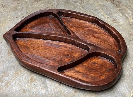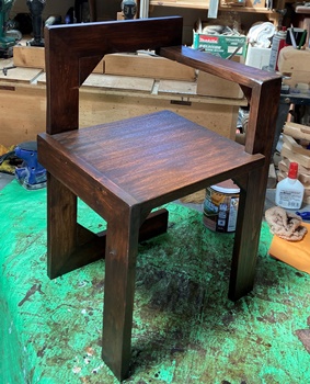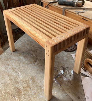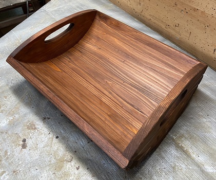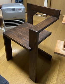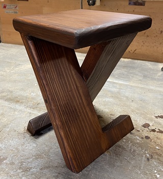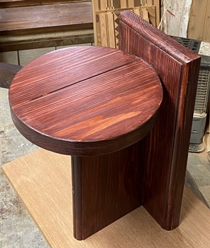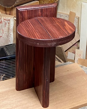| チーク色の3度塗りで仕上げる。まあまあいい色は出た。 材は3cm厚の杉、天板縦横19*20.5cm、高さ27cmの飾りスタンド。 |