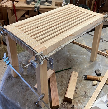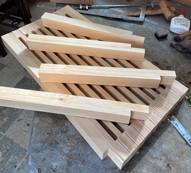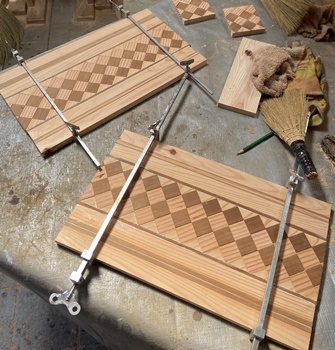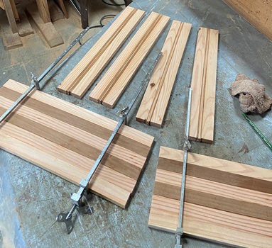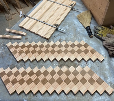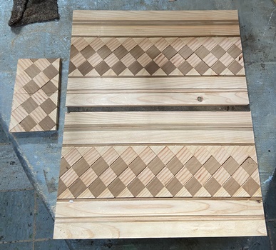 菱形模様入りの天板が好評だったので。材はレッドシーダ、米松と杉。 |