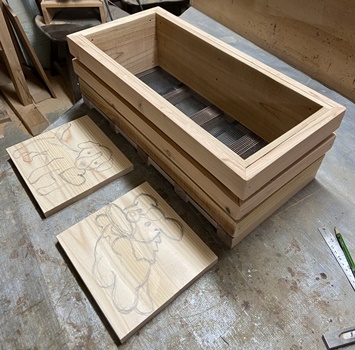 | 内寸(容積)の縦横深さが20*48*15.5cmのただのハコを1cm厚の杉板で。 箱の外側にアクセントで、1.5cmと1.2cm厚板を帯状に3段に巻いて厚みを付ける。 |