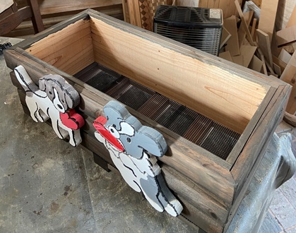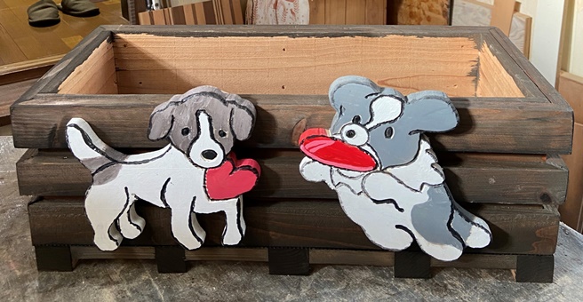 | 適当な塗料が無くなっていたので、防腐剤を塗り込んだ後はウォルナット色のオイルステインを塗る。 ウォルナットというよりは薄墨みたいな色で、かなり地味。 色合いの悪さを漫画チックな2匹の子犬でカバー?して、明るく楽しいプランターに。^^ |
