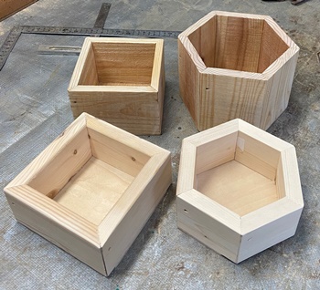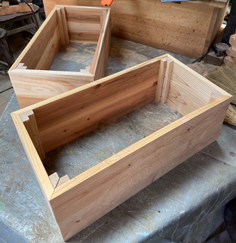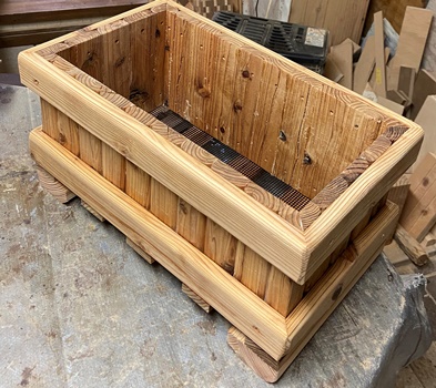 | ずっと前に角材を板状にカットした残り板、割れ目がひどいので使えなかった部分、 捨ててしまうのも勿体ないので、強引にプランターにしてみる。自宅用に。約26*45*18cmのサイズ。 |