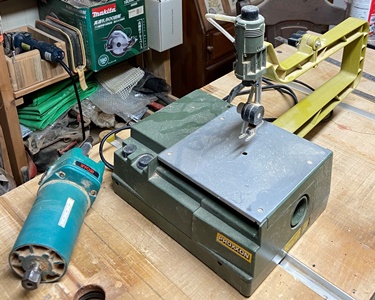 | プロクソンの糸鋸(コッピングソーテーブル)が壊れたら、 今度はトリマーテーブルで使っていたトリマー (リョウビTR-51)が逝ってしまった。(T_T) どちらも5年ほどよく働いてくれてた。(合掌) |