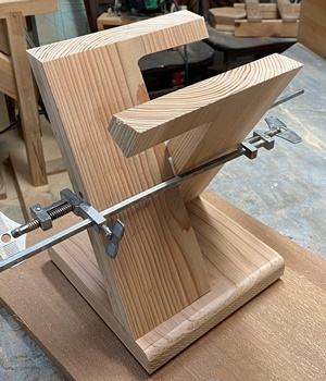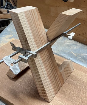 | L字の脚が交差する形が面白いと思って試作。交差する部分はダボ接続。 60°の交差で脚がX字のスタンドに。 (出来上がってみると割と地味..) (^^) |