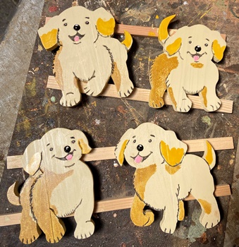 仔イヌのイラストを15mm厚板で切り抜き。サイズは縦横およそ15cm。