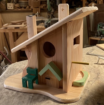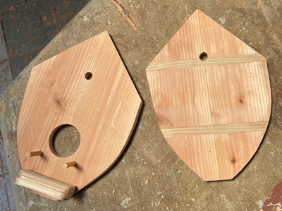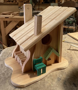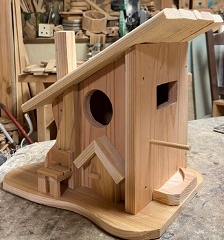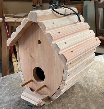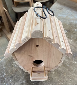 材は殆どが端材ハコからかき集め。 棒状の端切れ揃えて、ぐるっとくるむ。 20cmほどの高さの小屋で、 出入り口は表側だけ。 枝につるすことを想定した形だけど、 底も4cmほど平ら部分を作っておく。