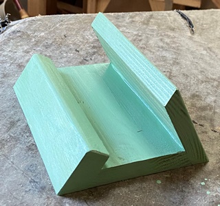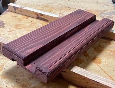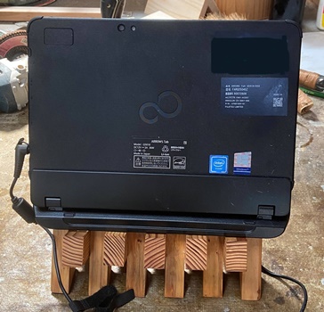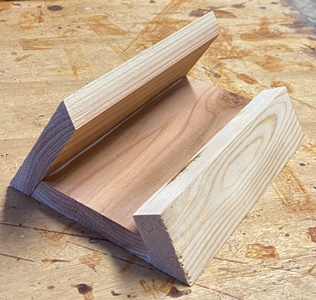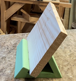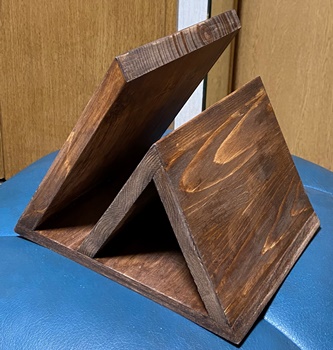 "素朴な形のタブレットスタンドを作ってもらいたい.." との要望があったので作成。 仕上がりサイズが幅 22cm 、高さ約 20cm で、 2cm*3cm の棒を組んでスタンドにしてみた。 前を 30 °カット、下脚を 55 °カット。 ぼんやりイメージした形でやってみたが、 結構ガッチリしたスタンドになった。 タブレット(手許になかった)でなくても、 ノートPCでも置いておける。