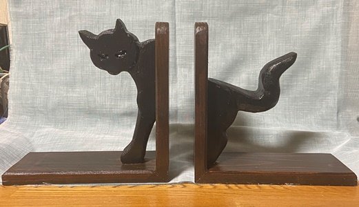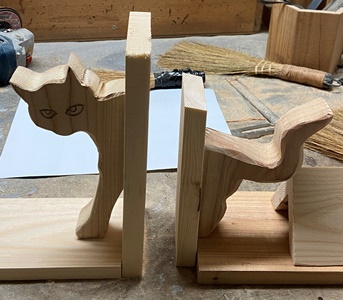 猛暑日が続いてます。 作業意欲もアイディアもかなり不調で...。m(_ _)m ネコのイメージシルエットを両側に置いたブックエンド、面白いかな..と始まった。 ネコのシルエットは3cm厚杉をカット&削り。 ブックエンドの板は9*20cm。
