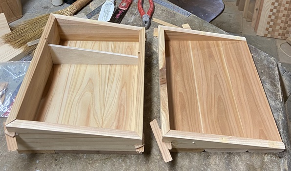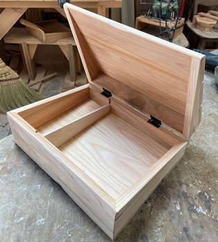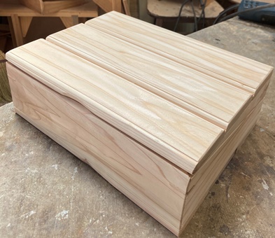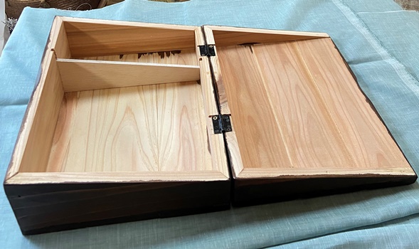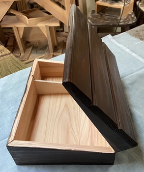 内側に少し染みてしまった部分もあるが、きれいな平箱ができたんじゃないかな。 お店のカウンター辺りに置くと、使い途もあるかも。