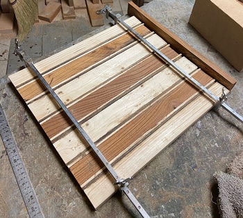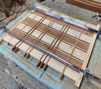 18mm厚で模様板の接ぎ合わせ。内側の赤味、けやき材を縦挽きしている時に