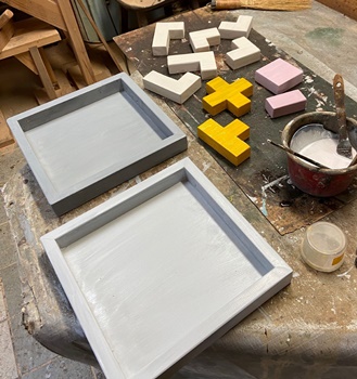 積み木パズルと幼児用のパズル、成形は終わったが、何か可愛い色を塗っておかないと仕上がりにはならず、これが案外と厄介。