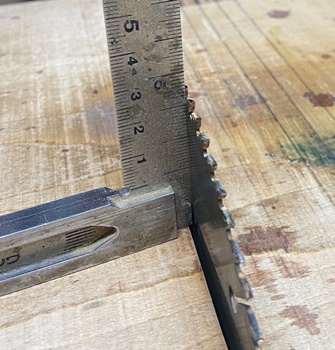 ちょっと厚みのある材を縦挽きしていたら垂直に切れていないことに気づいた。
