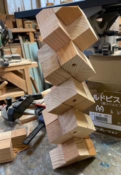 3.5cm角のサイコロ、30個で柱を作る。3つをコの字型にしたものを階段状に組んでみた。