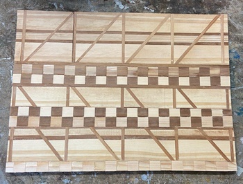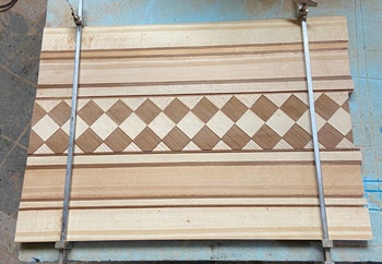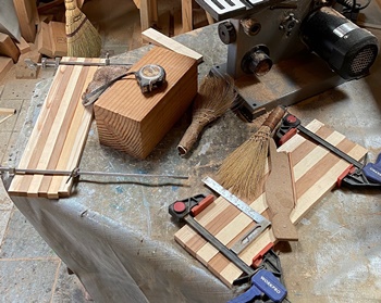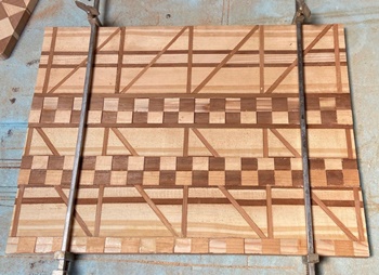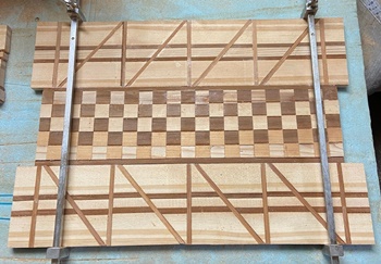 バンドソーをメインに使っての板の厚み揃えから模様板の組み接ぎ、やってみたが、