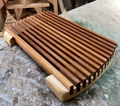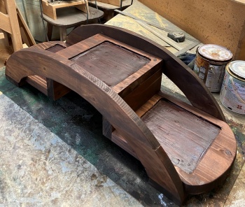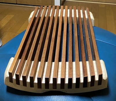 21.5cm幅、65cm長の演台状の台を、18mm厚 8cm幅の弓形フレームで挟んでみた。