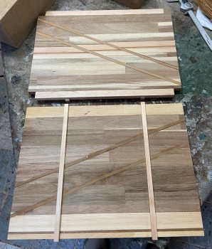 とりあえず 27mm 厚の板に 3mm 幅でカットしたレッドシーダを間に挟み、模様入りの接ぎ合わせ板を作る。