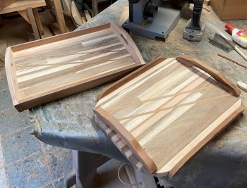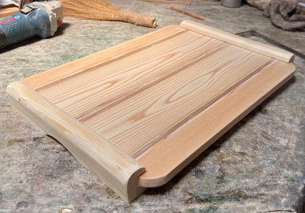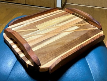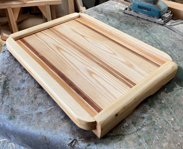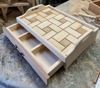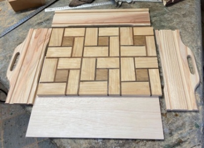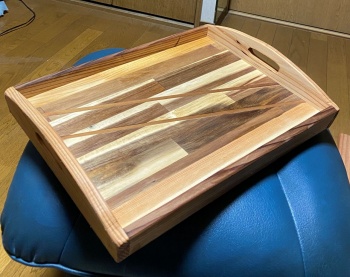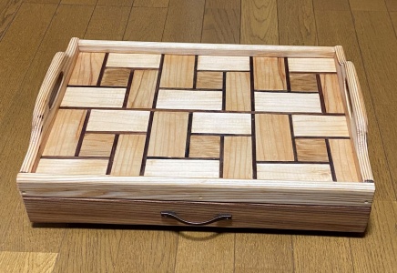 簡単な模様を入れた接ぎ合わせ板をトレー面にした。