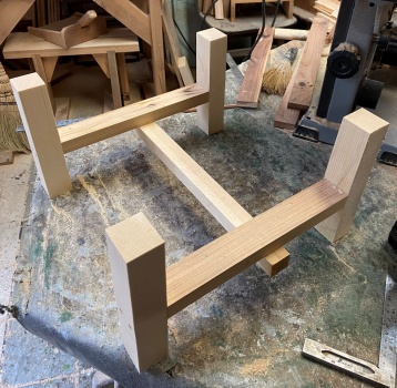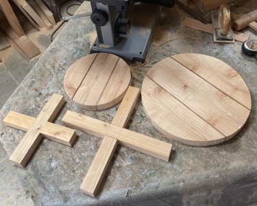 内側の小さいのが直径 21.5cm 、高さ 21cm 。脚は木口 3.5*4.0cm でカットして組む。