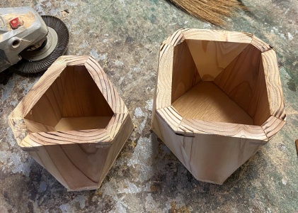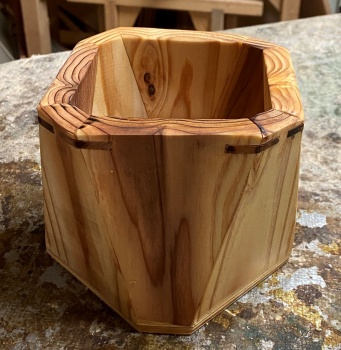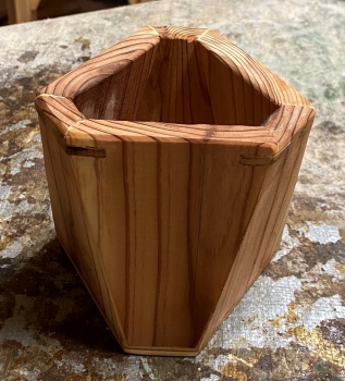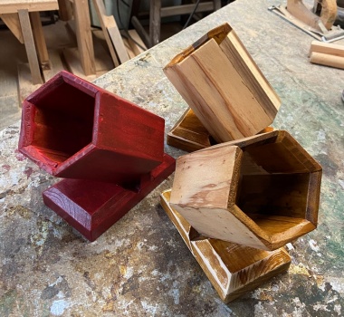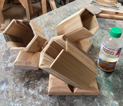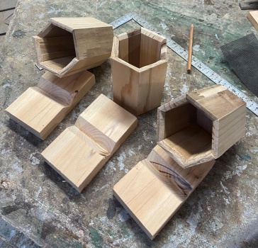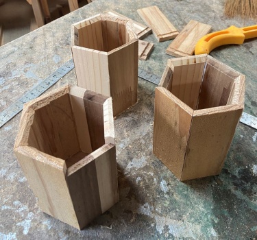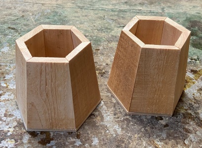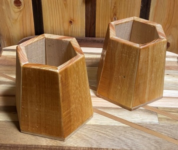 3角形のような6角形と4角形のような8角形のボックス。深さは 10cm 以上とったので、鉛筆立てにも道具差しにも使える。 |