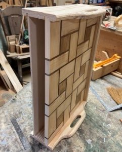 側板の飾り模様、迷った末に余り材かき集めて側面と背面の3面やってみてしまった。^^ (右上) |