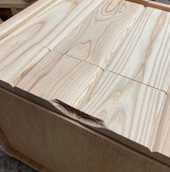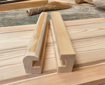 両袖に使ったのは木口 38*45mm でカットした赤松。外側に 8 °ほどの傾きを付けた。傾きは 10 °ほど付けても良かったのだが、溝のはめ込み部分が浅くなりそうなので微妙に 8 °で止めておく。